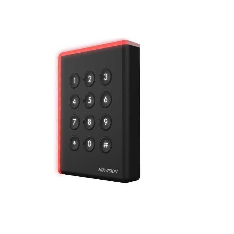 Cititor card cu tastatura Hikvision DS-K1801MK, citeste carduri MIFARE 13.56MHz, distanta citire: 50mm, comunicare: Wiegand 26/34 protocol, tastatura cu 12 butoane, indicator LED de stare si alimentare; alimentare: 12VDC, IP65, dimensiuni: 87×87×13.3mm