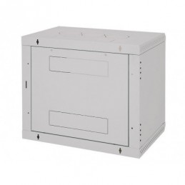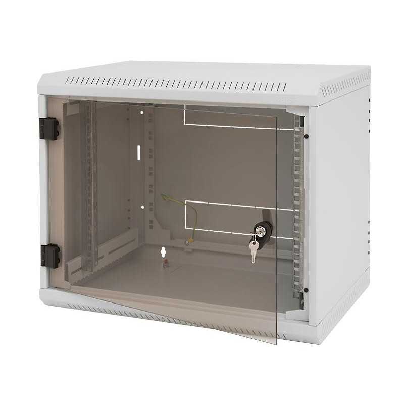 Rack de perete Triton sectiune simpla 12U 600mm adancime usa sticla panouri laterale fixe sectiuni, sectiuni acces cabluri sus/jos/spate securizare cu cheie, 1 pereche montanti reglabili IP30 gri
